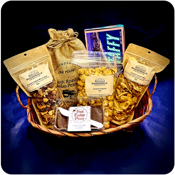 1lb jumbo roasted peanuts in shell in burlap bag, 5oz caramel popcorn, 15oz box assorted saltwater taffy, 8oz chocolate fudge, 8oz roasted salted mixed nuts, 8oz tropical crunch mix